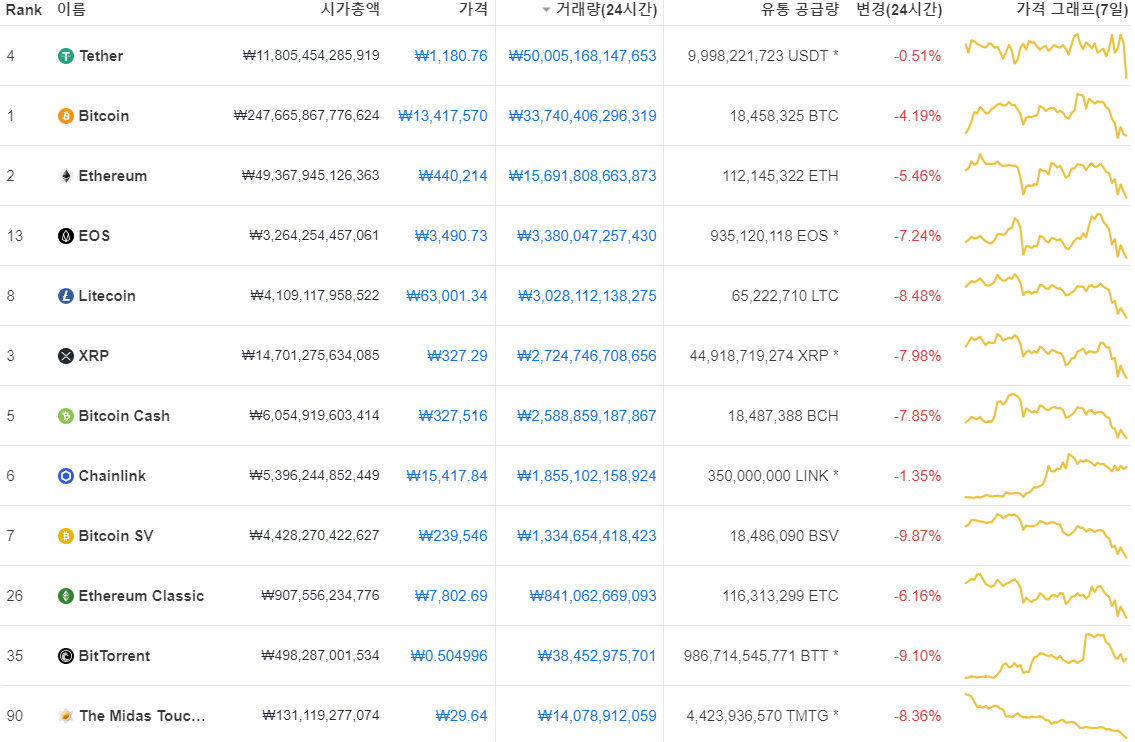 이오스(EOS)는 -7.24% 하락한 3,490.73원에 거래 중이며 라이트코인(LTC)는 -8.48% 하락하며 6만 3,001.34원에 거래되고 있다. 리플(XRP)은 -7.98% 내린 327.29원에 거래 중이다. 비트코인캐시(BTC)는 -7.85% 떨어지며 32만 7,516원에 거래 중이며 체인링크(LINK)는 -1.35% 하락한 1만 5,417.84원에 거래되고 있고 비트코인SV(BSV)는 -9.87% 내린 23만 9,546원을 기록했다.
